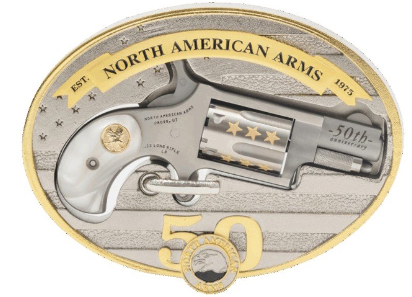 North American Arms, MFG# NAA-22LR-BBO-50, UPC: 744253003790, UOM: EA, 50th Anniversary Belt Buckle Gun, .22 LR, 1.18′ Barrel, Stainless/Gold, White Pearl Grip, 2-rd, NORT, NORTHG25, NORTHGALL, HG25, HGALL