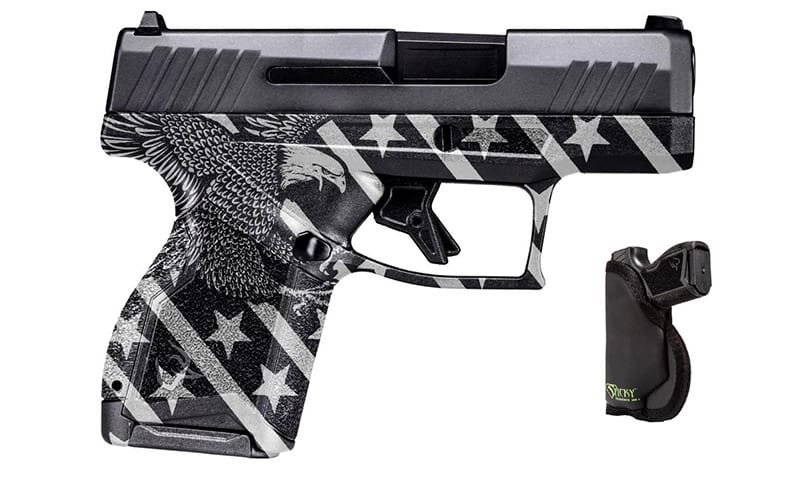 Taurus, MFG# 1-GX4M931-EN5, UPC: 725327941118, UOM: Each, GX4, 9mm, 3″ Barrel, Black/Eagle US Flag, Sticky Holster, (2) 11-rd, TAUR, TAURHG10, TAURHGALL, HG10, HGALL