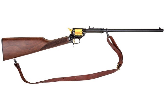 Heritage, MFG# BR226B16HSGLD, UPC: 727962708217, UOM: EA, Rough Rider Rancher, 22 LR, 16″ Buckhorn sgt Black/Walnut, Gold w/Leather Sling, 6-rd, HERI, HERILG34, HERILGALL, LG34, LGALL, Case: 5