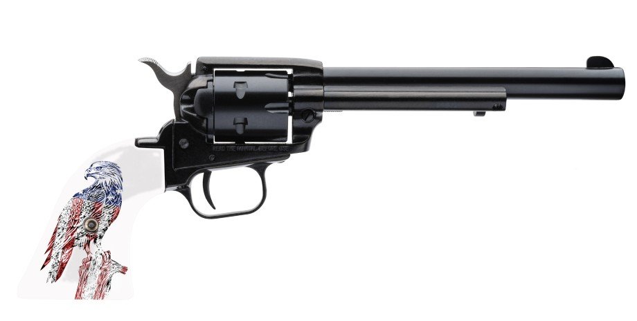 Heritage, MFG# RR22B6-PE, UPC: 727962710289, UOM: EA, Rough Rider, .22LR, 6.5″ Barrel, Fixed Front Sight, Black, Patriot Eagle Grips, 6-rd, HERI, HERIHG20, HERIHGALL, HG20, HGALL