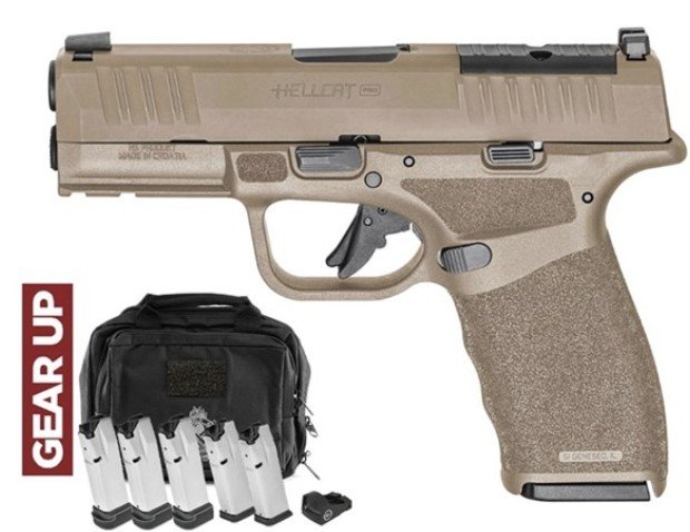 Springfield Armory, MFG# HCP9379FOSP-GU25, UPC: 706397990299, UOM: EA, Hellcat Pro Compact OSP, 9mm, 3.8″ Barrel, CT-1500 Red Dot, Range Bag, FDE, (3) 15-rd & (2) 17-rd, GEAR UP, SPRI, SPRIHG10, SPRIHGALL, HG10, HGALL