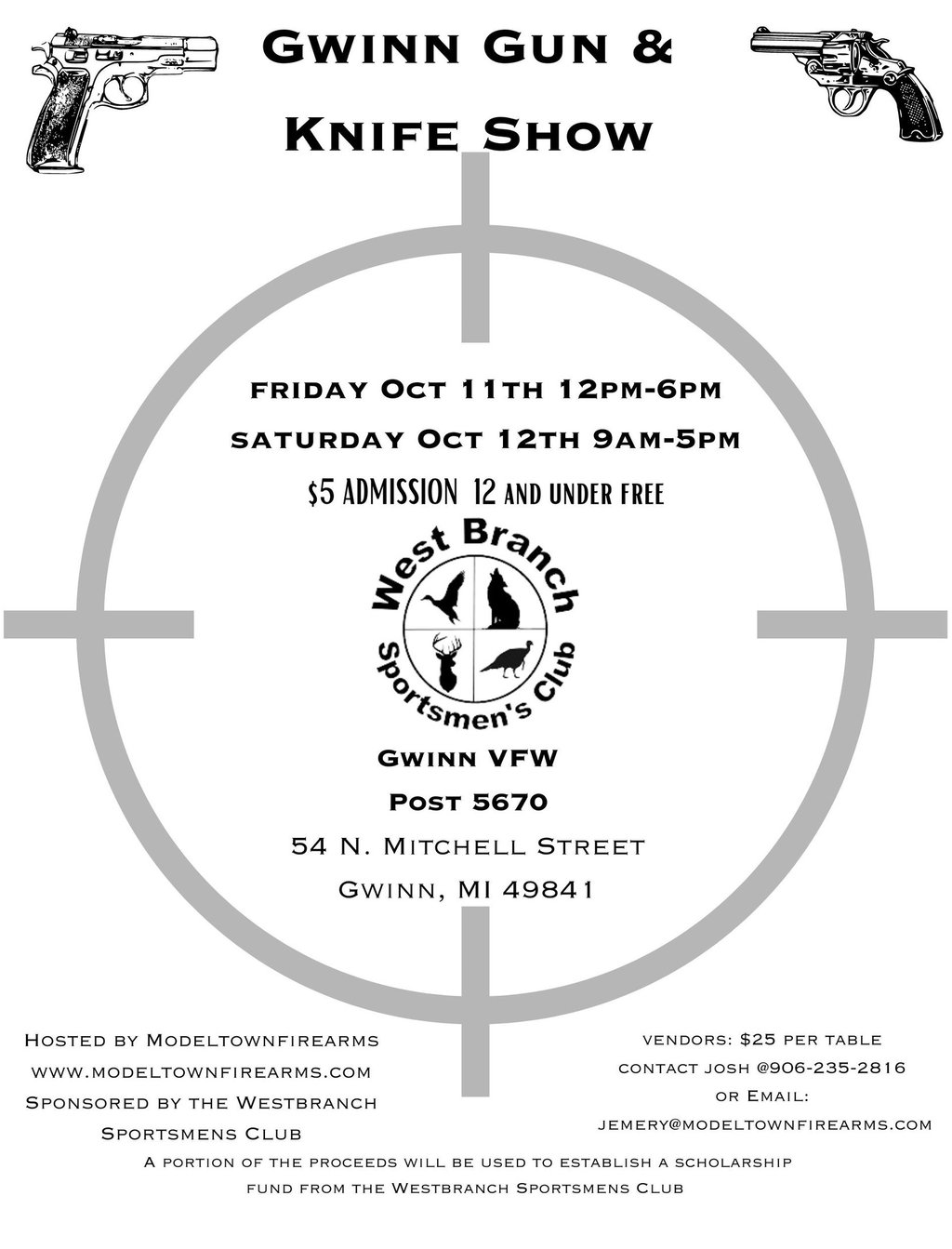 Vendors should use the form below, text 906-235-2816, or email: jemery@modeltownfirearms.com to request tables.